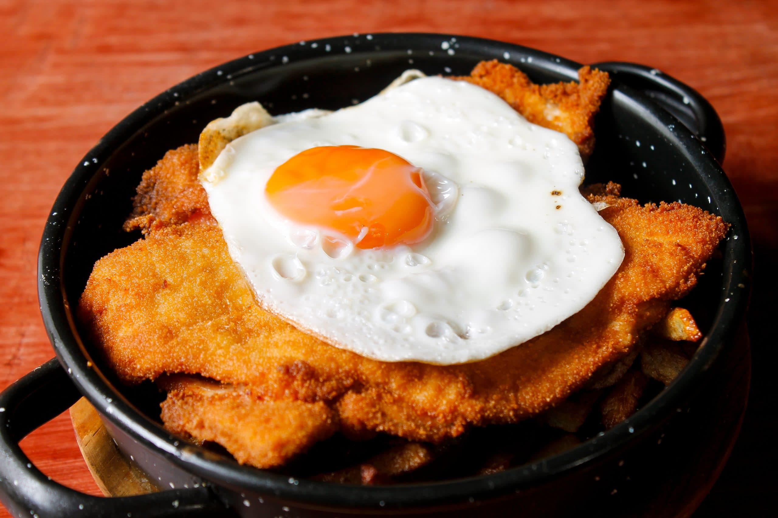 • Cachopín de cerdo relleno de york y queso, huevo y patatas.