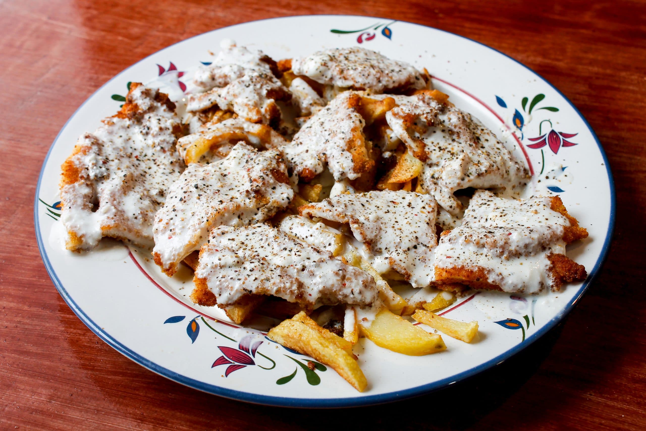 - Escalopines de pollo a la pimienta con patatas.